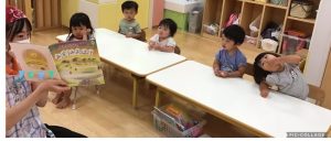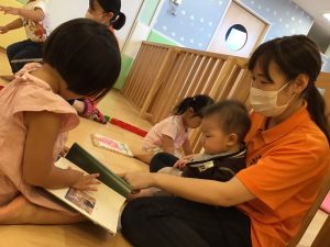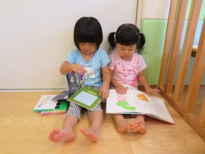 自由遊びの時に、絵本を取り出して、りんご組さんがもも組さんに絵本を読んであげている姿や