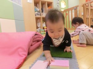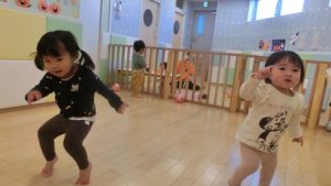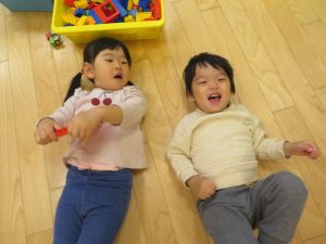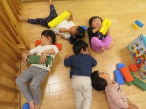 もも組さんが、夕方眠るといちご組さんりんご組さんも真似っこして床にごろ〜んと転がって真似っこ