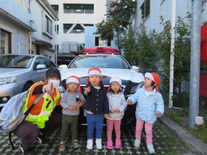 お散歩では、パトカーの前で記念撮影![]()