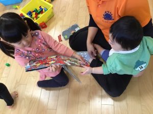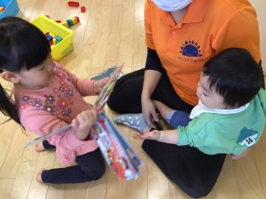 0歳児さんが絵本を読んでいると