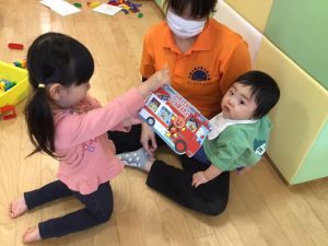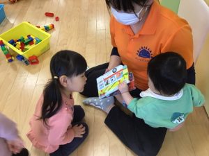 0歳児さんが絵本を読んでいると