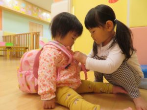 「おはよ朝の用意してあげる」とお世話をしてあげる姿にまたまたほっこりする保育士です