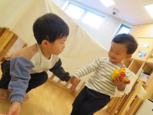 初めは、どきどき緊張したお顔でしたが、徐々に保育園生活に慣れて、にっこり笑顔が増えて、保育園でお友だちとのやりとりを楽しまれていましたこれからも、保育園で楽しいこといっぱいしていこうね