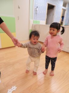 もも組さんといちご組さん歩いてお部屋をお散歩