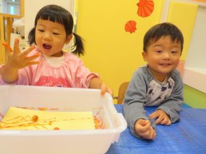箱の中に絵の具がついたビー玉を転がして楽しみました![]()