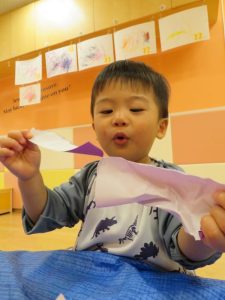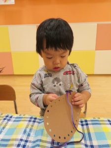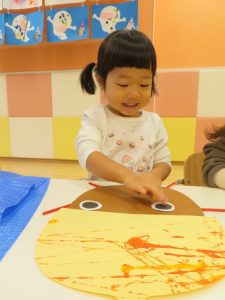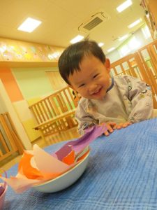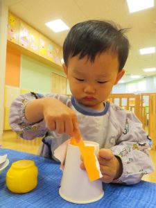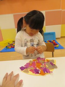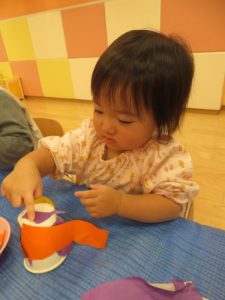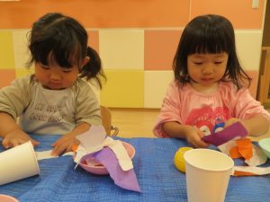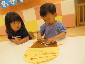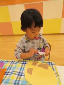 りんご組さんも、折り紙をペタペタ貼って、さつまいも作り![]()