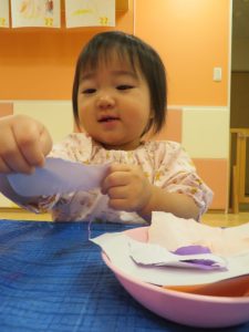 いちご組さんもビリビリ破った後は、のりを使ってペタペタ貼ってみの虫の完成![]()