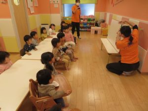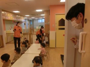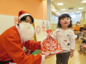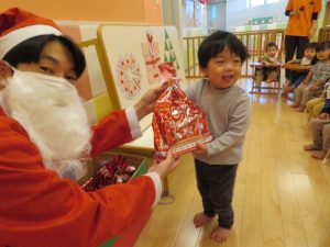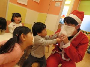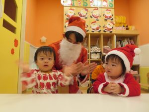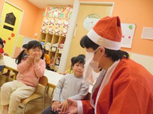 サンタがやってくる前に保育士が『10人のサンタ』の出し物をして期待を高めてくれました![]()