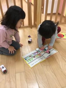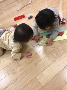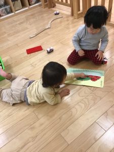 1歳児クラスさんと2歳児クラスさんのお友だちが一緒にお野菜や果物が出てくる絵本を見ておられました♪