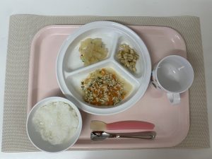 (写真は普通食になります。年齢によって盛り付け量を変えて、提供しています。)