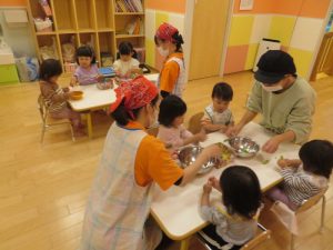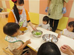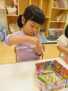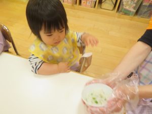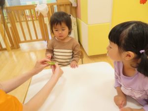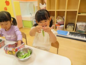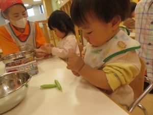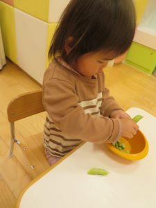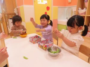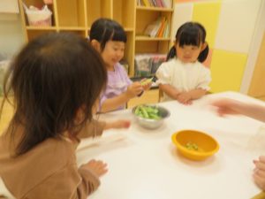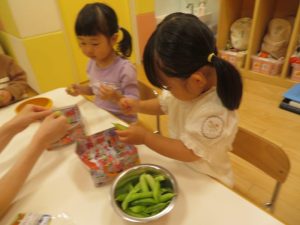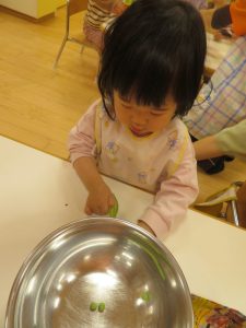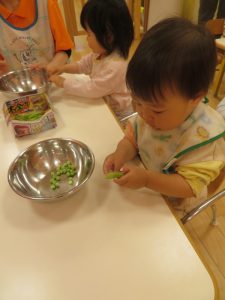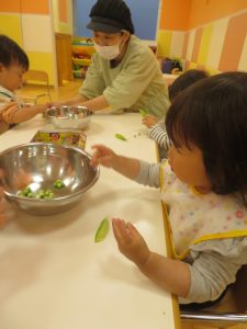 うすい豆を使って、苦手な野菜にも親しみをもてるように、見たり触ったりしました![]()