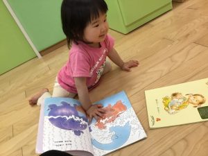 子ども達は、絵本でも雨降りの物を選んでいます![]()