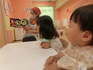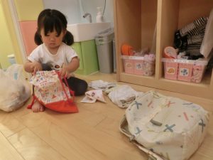朝登園すると、朝の用意をするりんご組さん
