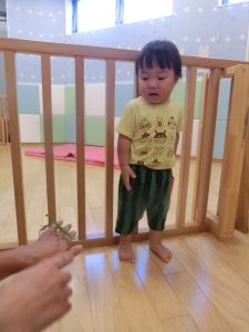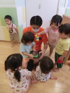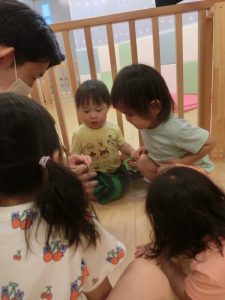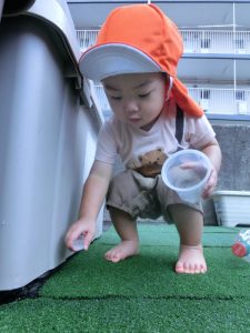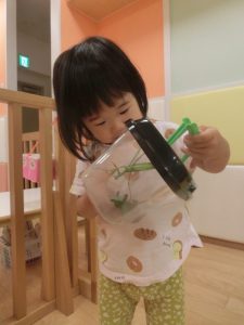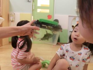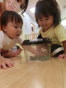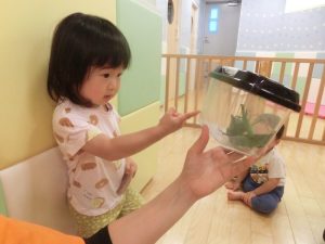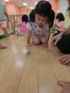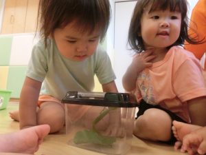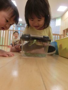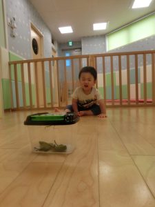 続きまして、保育士がカマキリを持ってきたので、お友だちと一緒に見てみました![]()