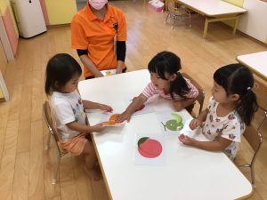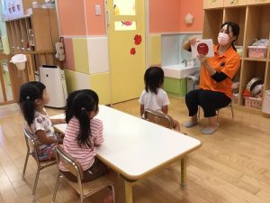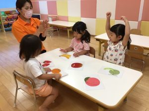 保育士が英語を言いながらフラッシュカードをめくります✨