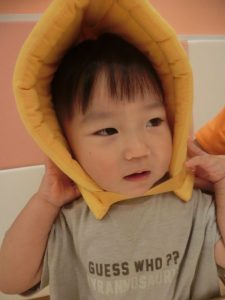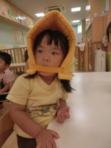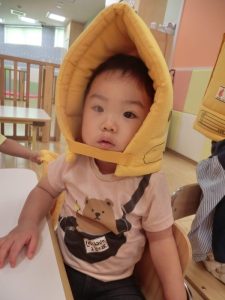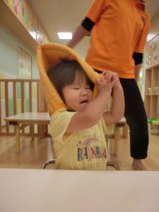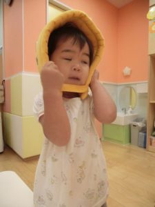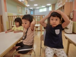 紙芝居を見ながら、頭を守る練習をしているところです![]()