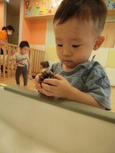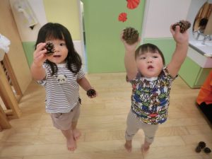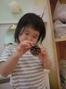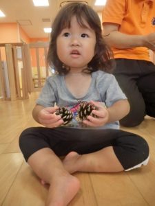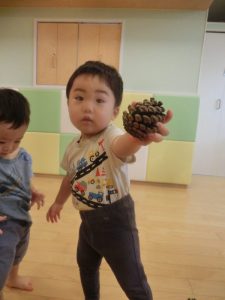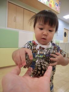 そろそろ秋になってきたので、職員が保育園に松ぼっくりを持ってきてくれました