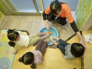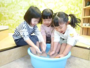 おやつを食べた後は、残った皮を使って、ゆずの手湯や足湯をしました![]()