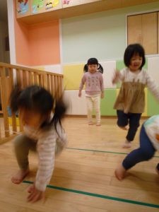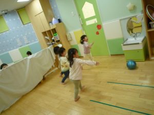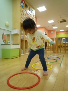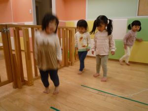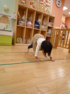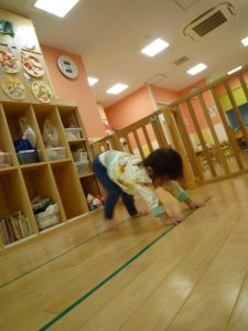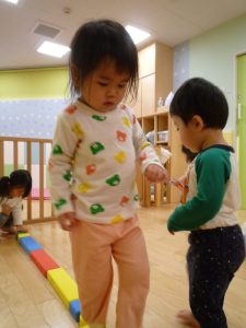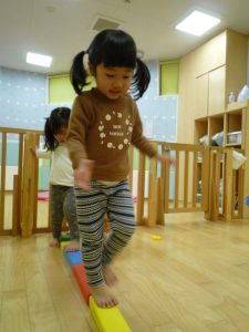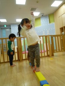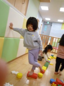 こちらの写真は、体操カリキュラムの時間ではなく自由遊びの時に、ソフト積み木で遊んでいると、体操でした遊びを思い出して、ソフト積み木を繋げて一本橋をしているところです