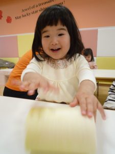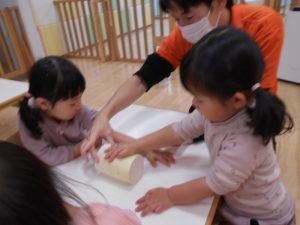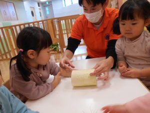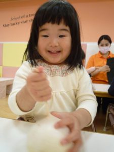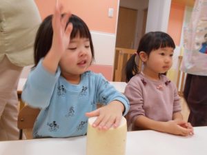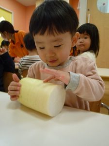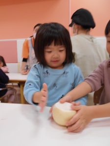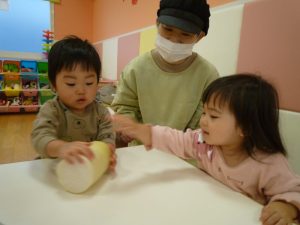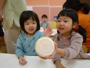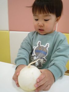 給食の先生とお話ししながら、かぶや大根に触れて楽しいでまーす![]()