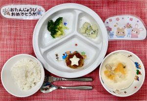 ごはん スープ ハンバーグ ブロッコリーのおかか和え 粉ふき芋