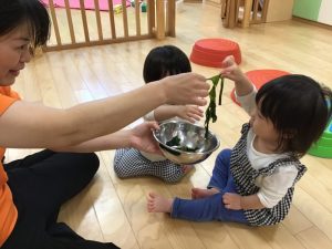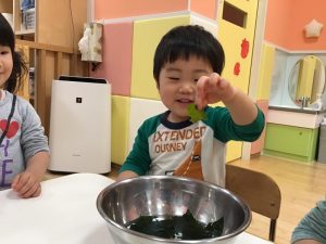 5月の食育活動では乾燥わかめに触れ、戻る様子を観察しました👀
