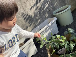 “何の葉っぱかなー?”とちょんちょんと触れ、苗に興味津々!!