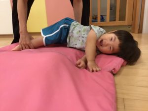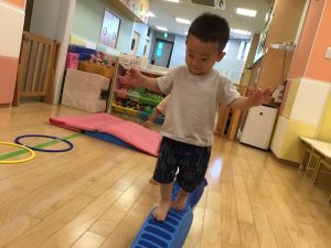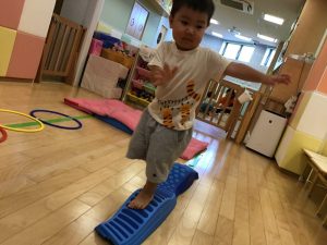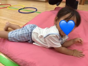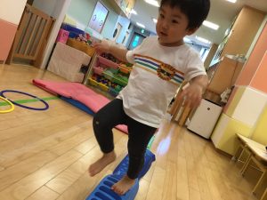 ・自ら横回転する・頭上からボールを投げる・捕る動作を覚える・色々な形でバランス維持