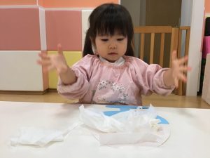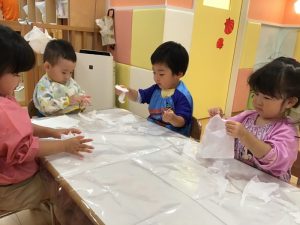ティッシュを破いたり、シロップや果物をトッピングしたりして、かき氷を作りました🍧