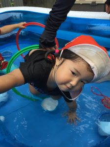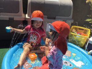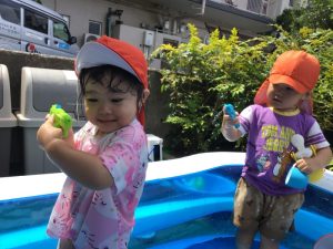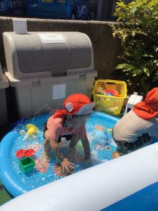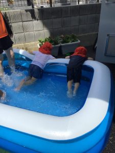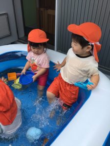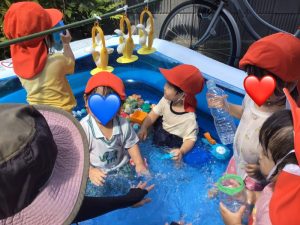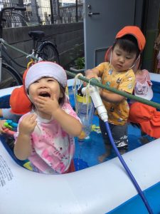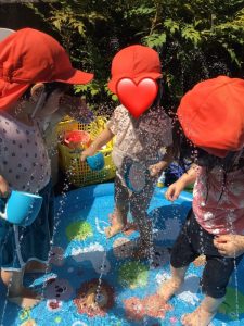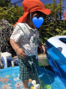 保育者がバシャバシャと水しぶきをあげると、いちご組のみんなも仲間入り🌟