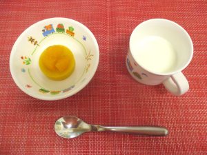 (写真は離乳食後期です。年齢によって形、固さ、盛り付け量を変えて、提供しています。)