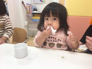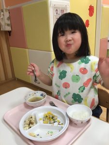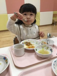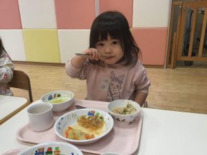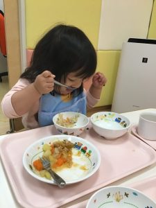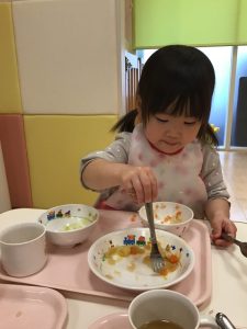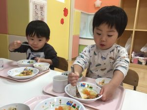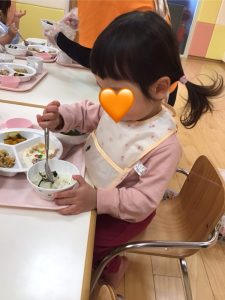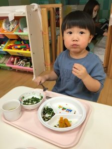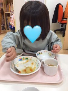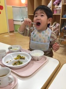 りんご組のお友だちは、お箸に向けて、スプーンやフォークを下から握って食べる練習中です☺️