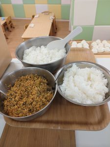 今日は、手作りふりかけを各自ごはんにかけてみました。そのまま食べる子、ご飯にしっかり混ぜる子、それぞれ思いおもいに行い、食育活動を楽しみました♪
