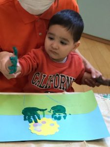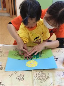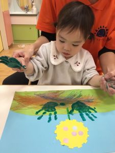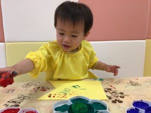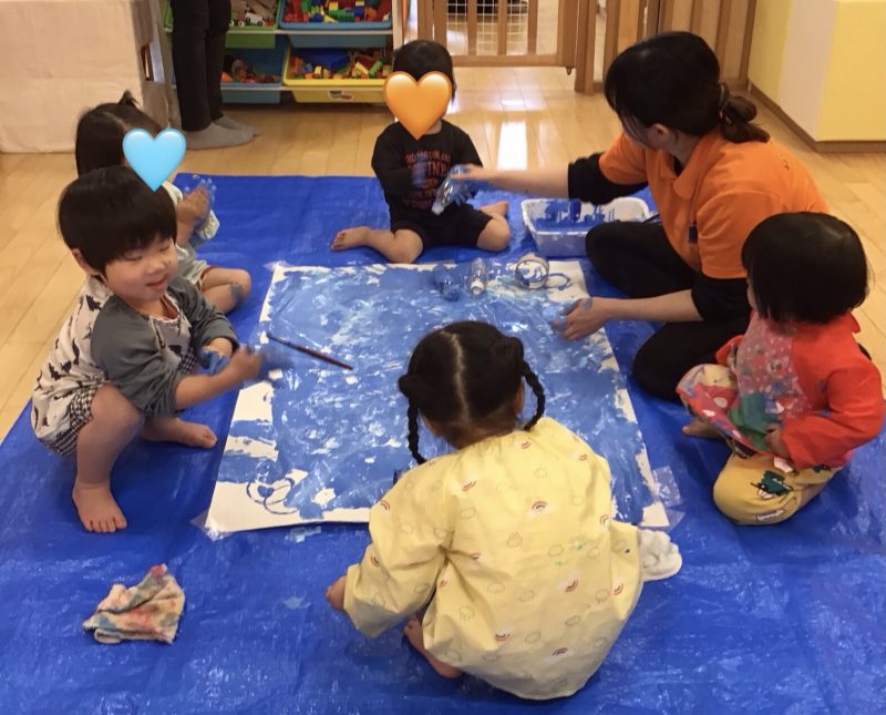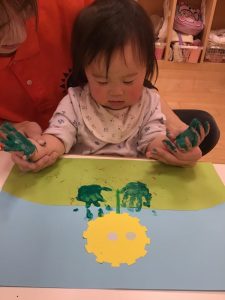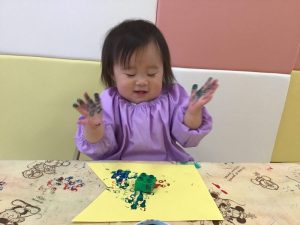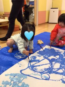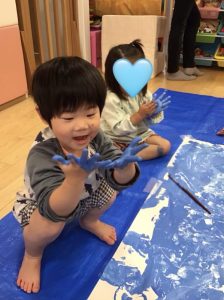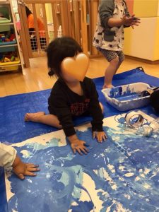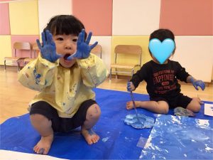 後半には、両手でペタペタと押していき、大胆に絵の具の感触を楽しんでいました😆