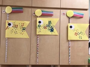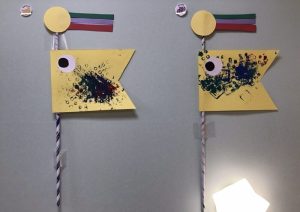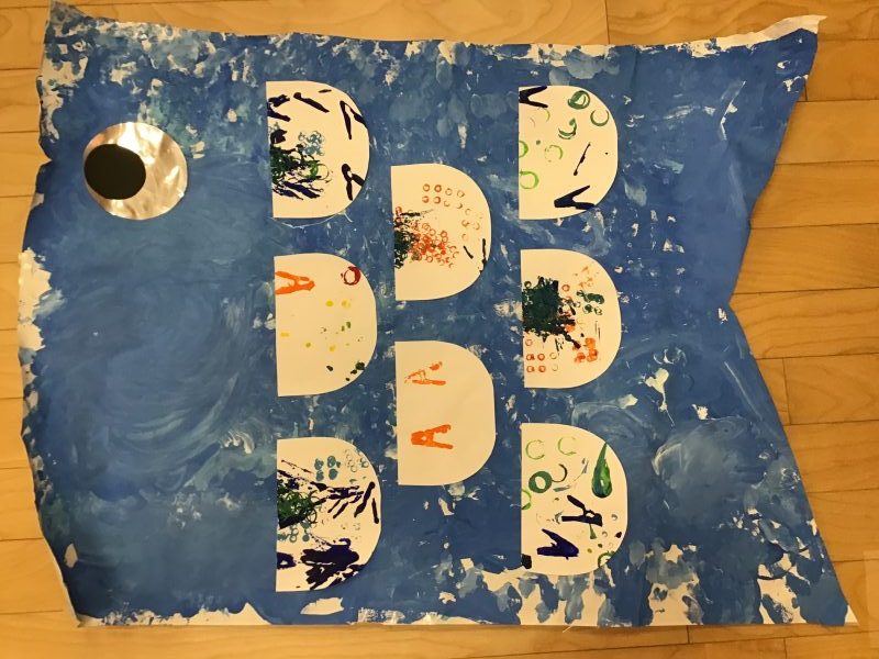 うろこは青はりんご組がスタンピング、ピンクはいちご組がお絵描きしたもので作りました😉