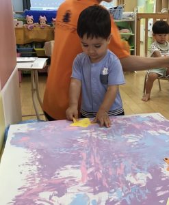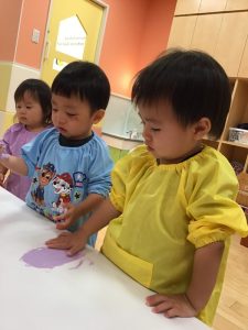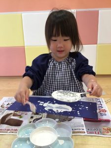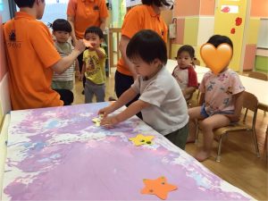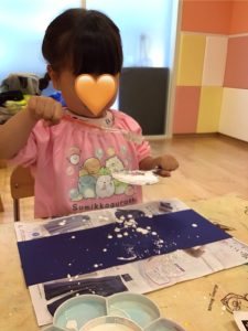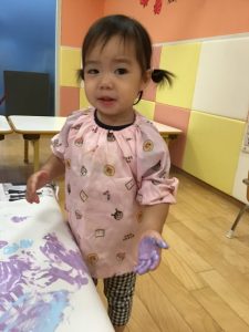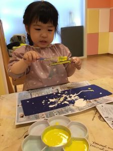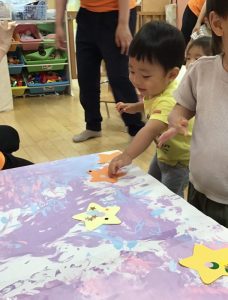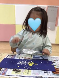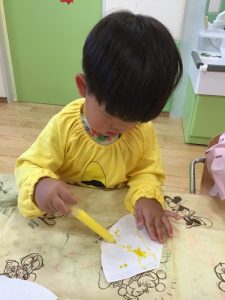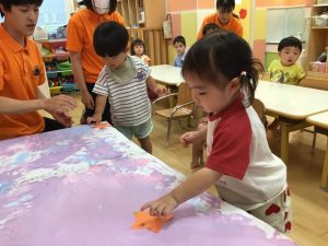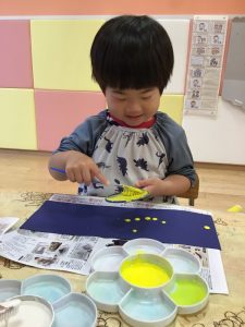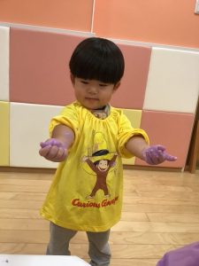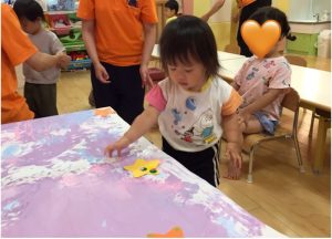 次は、みんなでペタペタと絵の具あそびを楽しんだところへ🎨