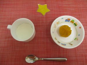 (写真は後期食です。月齢によって形、固さ、盛り付け量を変えて提供しています。)