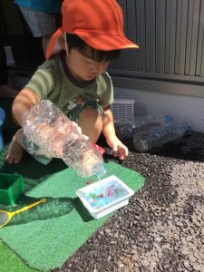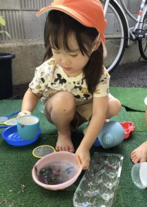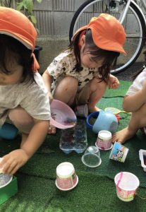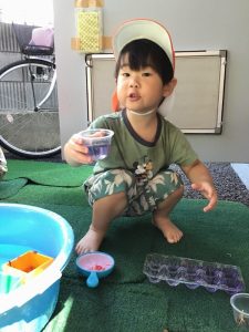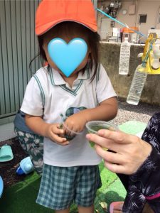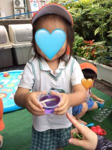 園で育てた朝顔や草花、さつまいもの葉などを使って、色水あそびをしました🍹