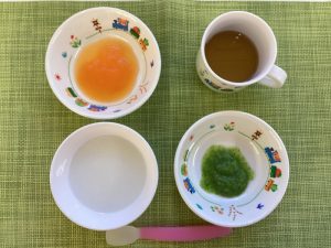 (写真は後期食です。月齢によって形、固さ、盛り付け量を変えて提供しています。)