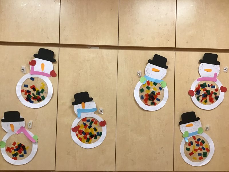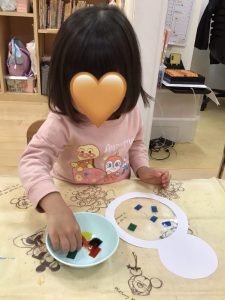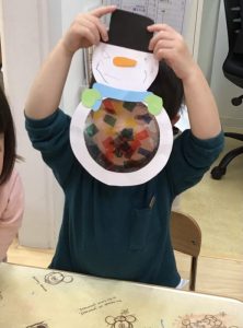 雪だるまのお腹にテープを貼って、セロファンを飾り付け🎶