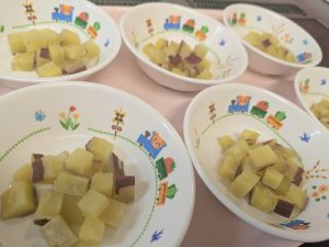 (写真は後期食です。月齢によって形、固さ、盛り付け量を変えて提供しています。)