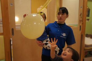 お友だちや保育者が膨らませた風船をポンポンと叩きながら