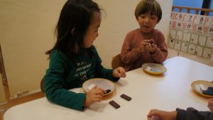 数で遊ぶゲームをしたり、ネイティブ講師に配られた色のブロックで、
