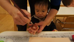 自分で選んで手形をとった鳥を見て嬉しそうに喜び、