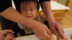 保育者に筆で塗ってもらうと嬉しそうに微笑む児や