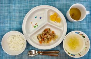 (写真は普通食です。年齢によって盛り付け量を変えて、提供しています。)