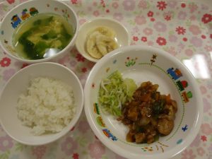 5月31日(木)のこんだて *いちご組さん・りんご組さん 酢豚風ソテー・コンソメスープ・キャベツのあ...