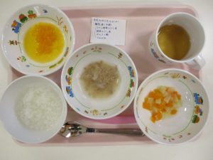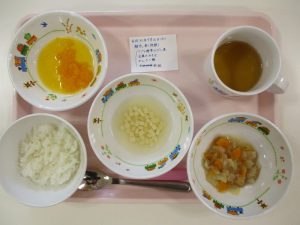ツナと野菜のだし煮、豆腐のみそ汁、七分粥、柑橘類(みかん缶)