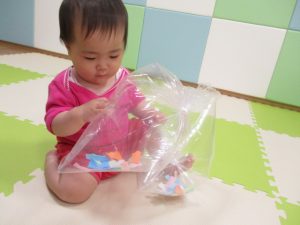 室内では普段遊んでいるブロックや知育玩具以外にも、布やビニール袋などを使って様々な素材に触れ、工夫して遊んでいます。![]()