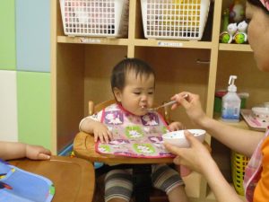 食後はミルクを飲んでいます。時間や量も月齢や発育に合わせて進めています (^O^)/